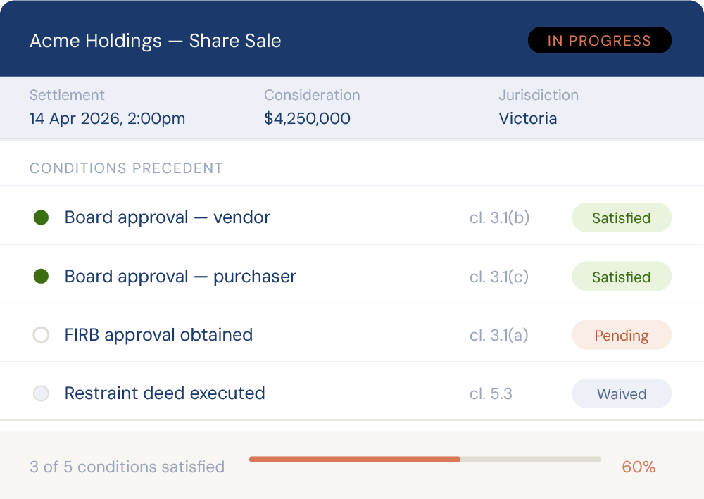 Track financial conditions, settlement adjustments, and post-completion obligations. Stay across the transaction without being across every email.